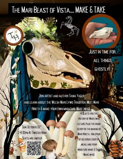 Event Description: Greetings and Salutations to you all. Tania from TwistedHeart Puppetworks will be hosting the next installment of our Make and Mead Craft Series. This time it is the “Mari Beast of Vista” Craft Event on June 22nd. So, scan the QR Code, find on Eventbrite, go to info@twistedheartpuppetworks or @twistedheartpuppetworks Tickets are limited. The price includes a pour of your favorite mead or cider, instruction, guidance and your own personal cat mask.