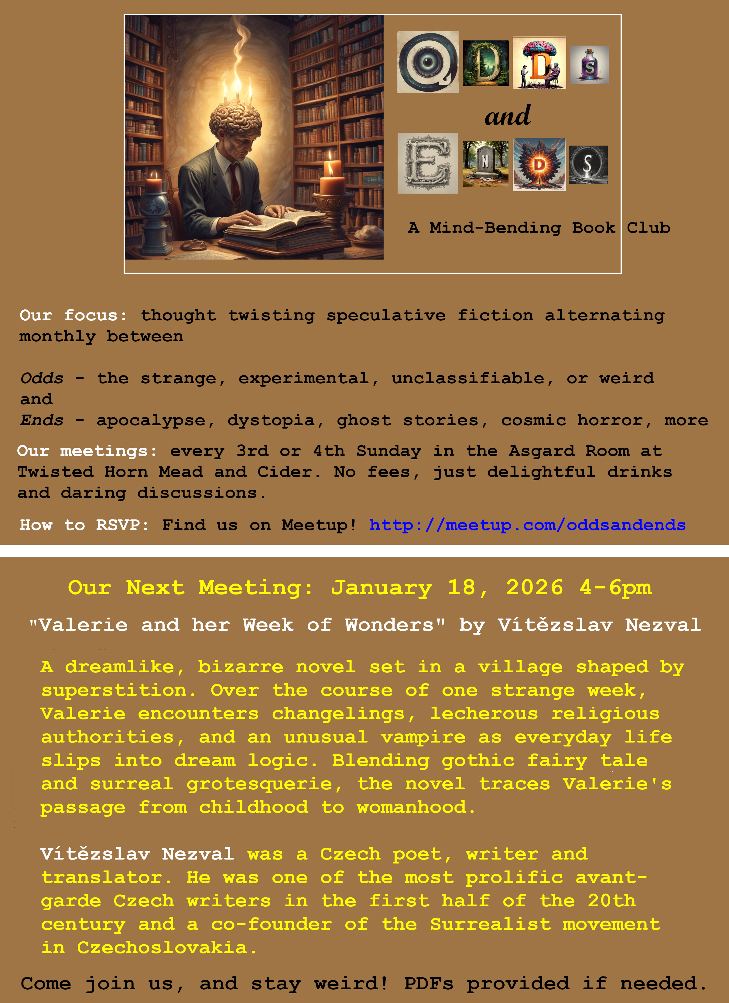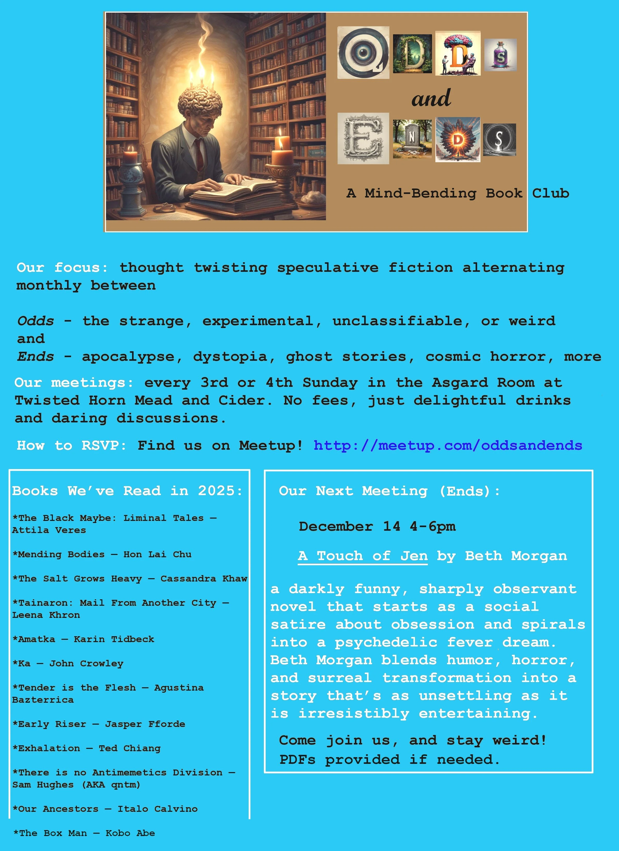 Event Description: The Odds and Ends Book Club, hosted at Twisted Horn Mead & Cider in Vista, CA, primarily reads speculative fiction - weird, horror, sci fi, mind-bending, literary fiction and etc. Come in, join the club and share some time with those with a love of literature. Meetings are held in the Asgard Room. For more info on which books will be discussed and general info, go to https://www.meetup.com/oddsandends/